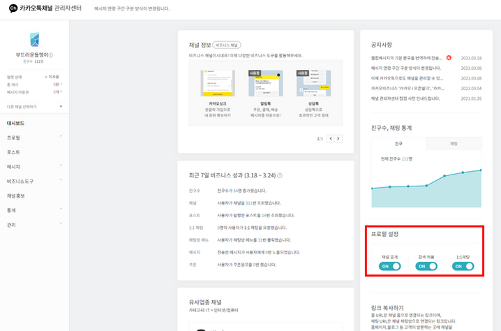 대시보드- 프로필 설정 - 1:1채팅 OFF