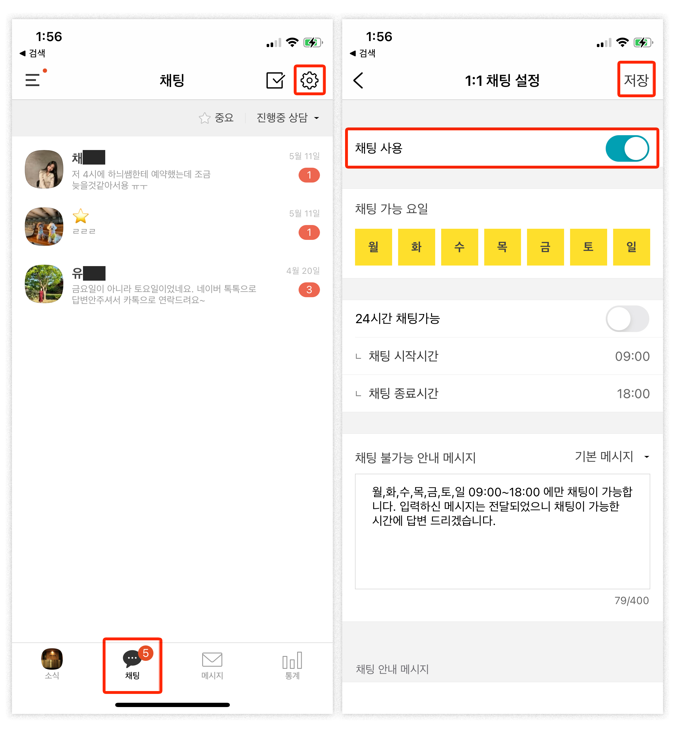 프로필 설정 - 1:1채팅이 ON 으로 되어 있을 경우고객님께서 알림톡에 답장으로 문의를 하실 수 있으니.실시간으로 상담하기 어려우신 매장의 경우아래 가이드처럼 프로필 설정에서 1:1채팅을 OFF로 변경해주시면 됩니다.
